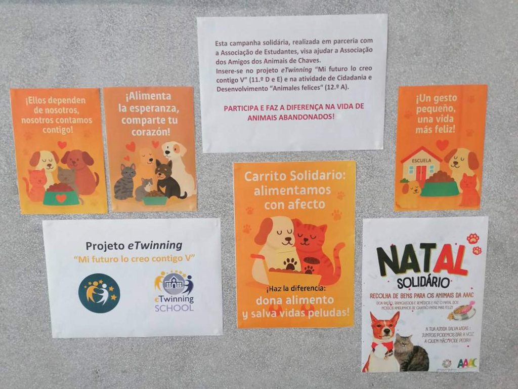 Inserida no projeto eTwinning “Mi futuro lo creo contigo V” (11.º D e E) e na atividade de Cidadania e Desenvolvimento “Animais felizes” (12.º A), a campanha convidou toda a comunidade educativa a participar e a contribuir para melhorar a vida de cães e gatos que aguardam cuidados e afeto.