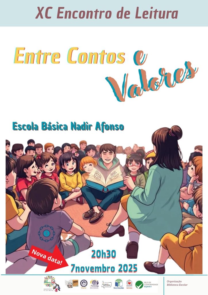 A biblioteca escolar tem a honra de o/a convidar para o XC Encontro de Leitura subordinado ao tema Entre contos e valores, que decorrerá na próxima sexta-feira, dia 07 de novembro, às 20h30, na Escola Básica Nadir Afonso.